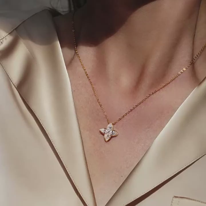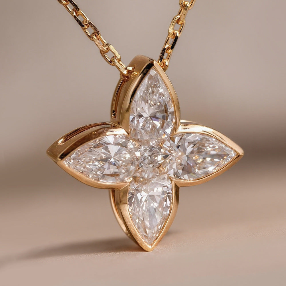 Add a touch of luxury to your look with this Moissanite Flower Pendant Necklace, crafted from 925 sterling silver and finished with a radiant gold plating. The pendant features a delicate four-petal floral design, each petal set with a sparkling marquise-cut moissanite that captures the light from every angle.